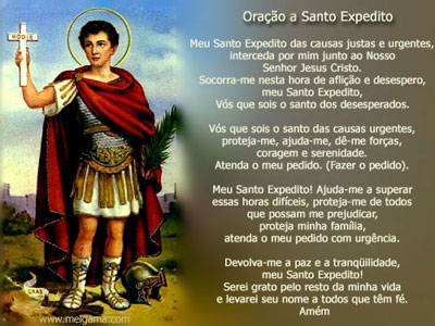 No Brasil, sobretudo, Santo Expedito é invocado nos negócios e dificuldades da vida. conhecido como “o santo das causas urgentes”.